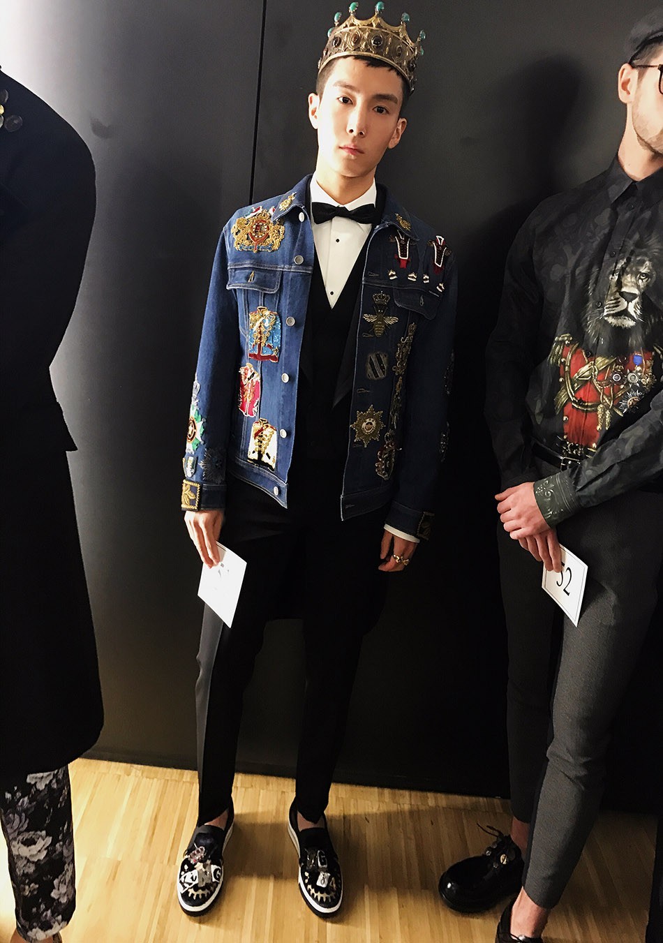 品牌设计师亲自为盛一伦挑选走秀造型,一身精工剪裁的经典燕尾服搭配精美刺绣牛仔外套,完美诠释古典“小王子”韵味。盛一伦年轻而满富贵族感的王子气质和品牌本季复古华丽宫廷感的氛围更是相得益彰。