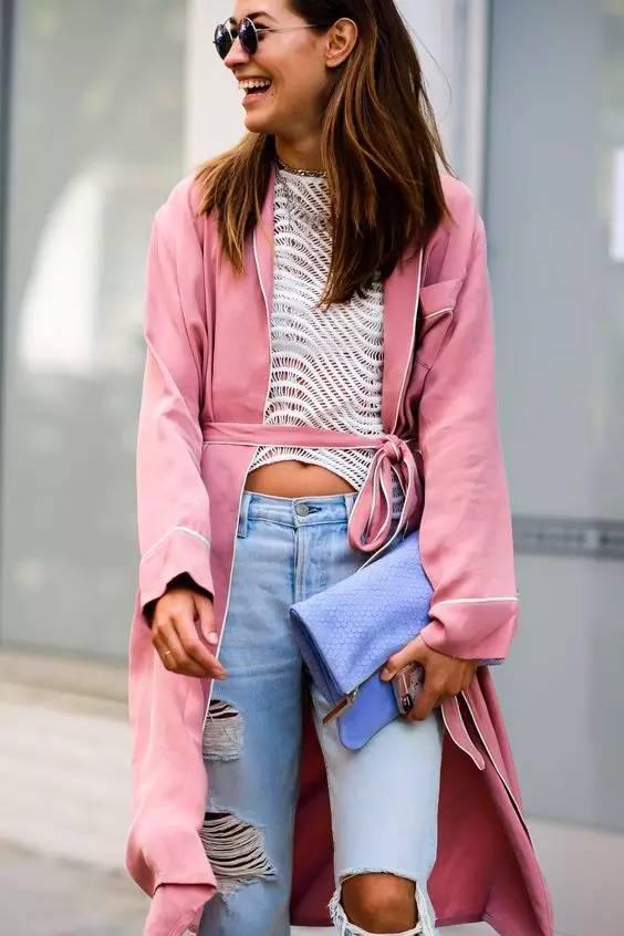 像下面的博主,一件粉色单品提亮整个造型。