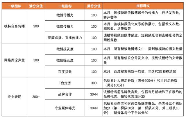 模特的自身传播包括其在微博、微信公众平台、综合类视频网站、短视频应用和直播平台上的传播数据。网络舆论声量包括各模特在微博、微信的提及度和百度指数。专业表现则分为三个指标,分别是T台走秀、品牌合作和专业媒体曝光。具体算法如下: