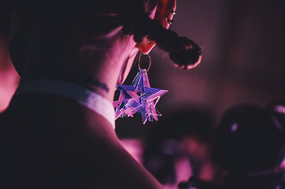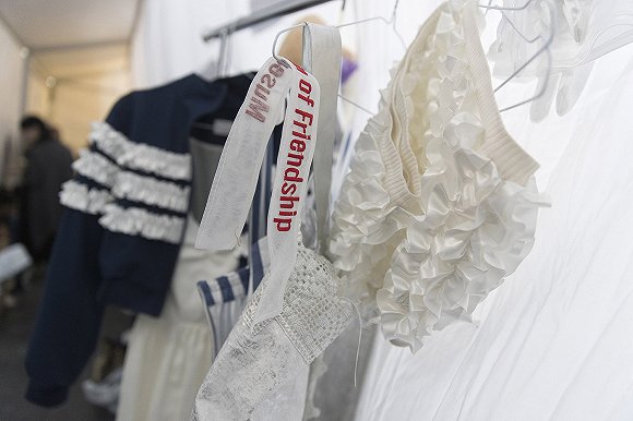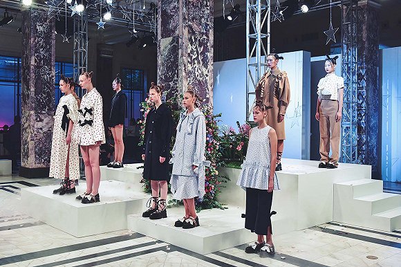 或许作为90后,雷留树和蒋雨彤更能理解少女的心思,当然也少不了这些少女们小时候看过且强烈热爱着的动画片《花仙子》。在动画片中象征着魔法力量的花朵和五角星也成为了这一系列里主要的元素。我们可以看见当初的少女似乎长大了一些,抛弃了鲜红的张扬色系,在2017ss的系列里,淡蓝紫色和淡粉被普遍运用,搭配SHU SHU/TONG招牌蝴蝶结和褶皱,拼接的不同色系的面料、不对称的裙摆、惹眼的灯笼袖子、厚底的绑带芭蕾舞鞋……模特们还佩戴着90年代风格的五芒星耳饰。用细节来描摹这些少女的遐想,或许正是SHU SHU/TONG在这一季里想要走心表达的东西。Presentation的最后,设计师和他们的朋友一同上前,将手中的花仙子卡通贴纸贴在了身穿白裙的模特裙摆上。
