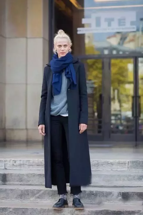 小脚裤配堆堆袜,此乃高难度搭配,还好模特聪明的选择和围巾(仔细一看似乎是毛衣变了个身)一样的颜色,不建议大家模仿。