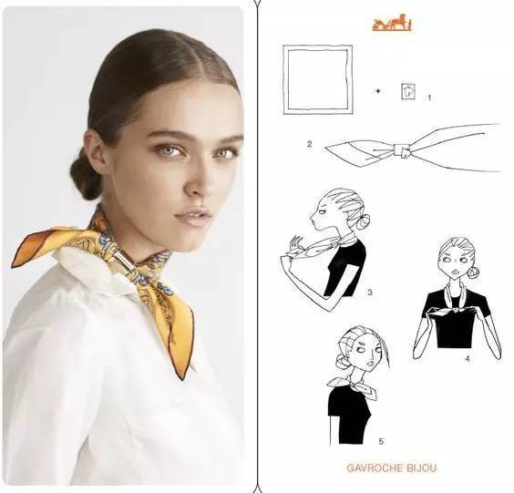 双侧垂系法的重点就是丝巾系好后,两边垂挂在领口的丝巾随风飘逸在领口,大气中又不失俏皮感。▼