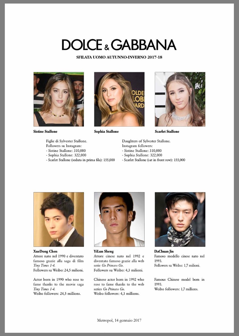 本季Dolce&Gabbana的走秀模特阵容相当强大,邀请了全球49个新生代当红偶像和艺人,除了中国演员盛一伦、陈学冬及超模金大川之外,还有史泰龙家的三个女儿,辛迪克劳馥家、裘德洛家的公子均在受邀模特之列,也体现了Dolce&Gabbana多元的文化理念。