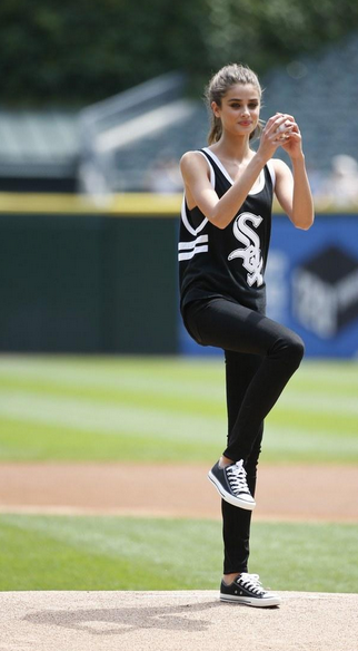 图为希尔曾作为开球嘉宾助阵美国职业棒球赛。