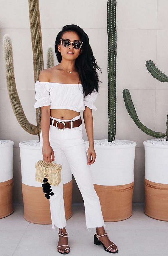 要凉爽,上衣的选择当然是布料越少越好。一字肩、吊带衫、露脐装可以露出上半身大部面积的皮肤,但又不会过分性感和艳俗。不经意的性感是制造清凉感的关键。下半身随意搭配牛仔裤或裙子永不过时。