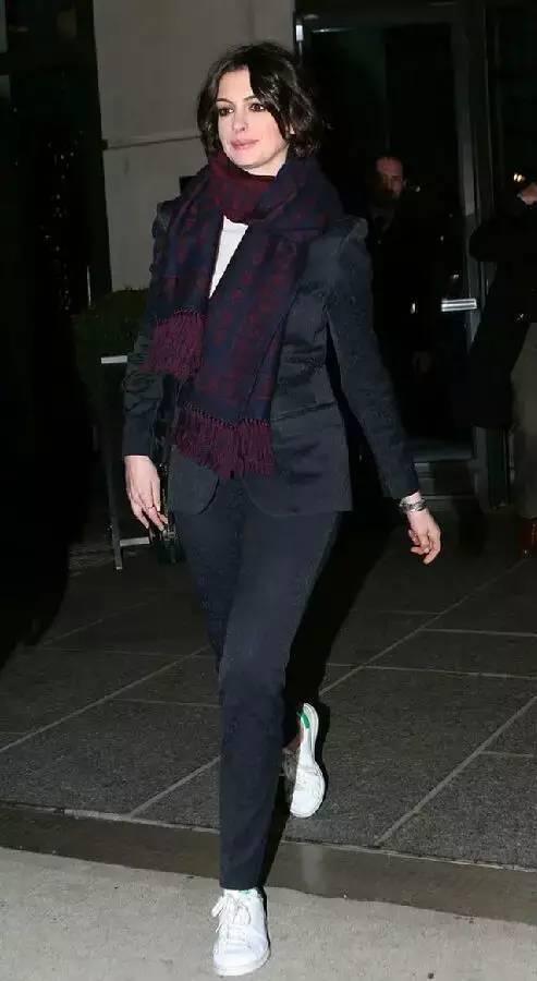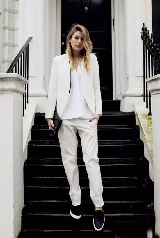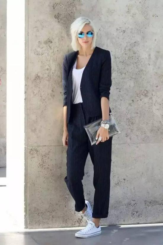西装&帆布鞋Oliva的西装搭配帆布鞋,看起来帅气干练又不失温婉女人味,V领白色内搭为整个造型多了点妩媚!