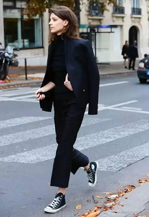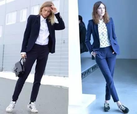 火爆全球的小白鞋,都有的举个手先!搭配黑色西装外套时髦到让你意想不到!微微露出的脚踝让你骨子里散发一些性感!