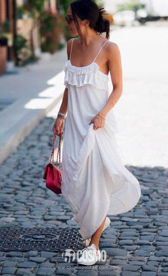 说到仙女宽,那就是长款的白色吊带了,平胸瘦姑娘穿起来最好看!大家的注意力也更多的放在锁骨有多美上,出淤泥而不染的清新模样也是很适合夏日度假。
