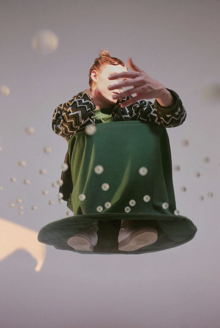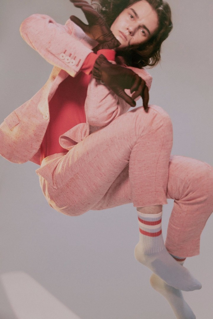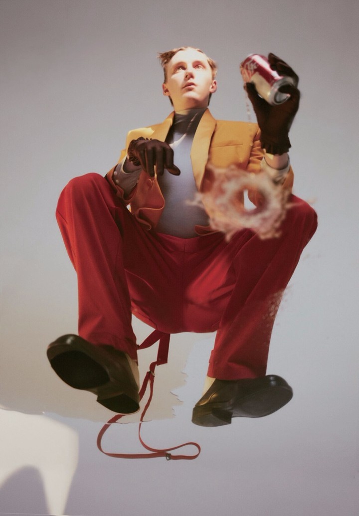 左: Jil Sander女士条纹衬衫、Emporio Armani咖色背带裤、Prada蓝色腰带、Loewe艺术画像包 右: Jil Sander浅蓝色衬衫、Prada塑胶印花女士腰带、Xander Zhou不规则设计卡其裤、Loewe艺术画像包