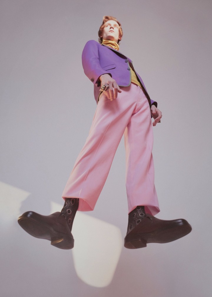 Jil Sander条纹女士垫肩西装、Balenciaga缎面女士连衣裙、缎面蓝色连体靴裤、Prada塑胶凉鞋、蓝色腰带
